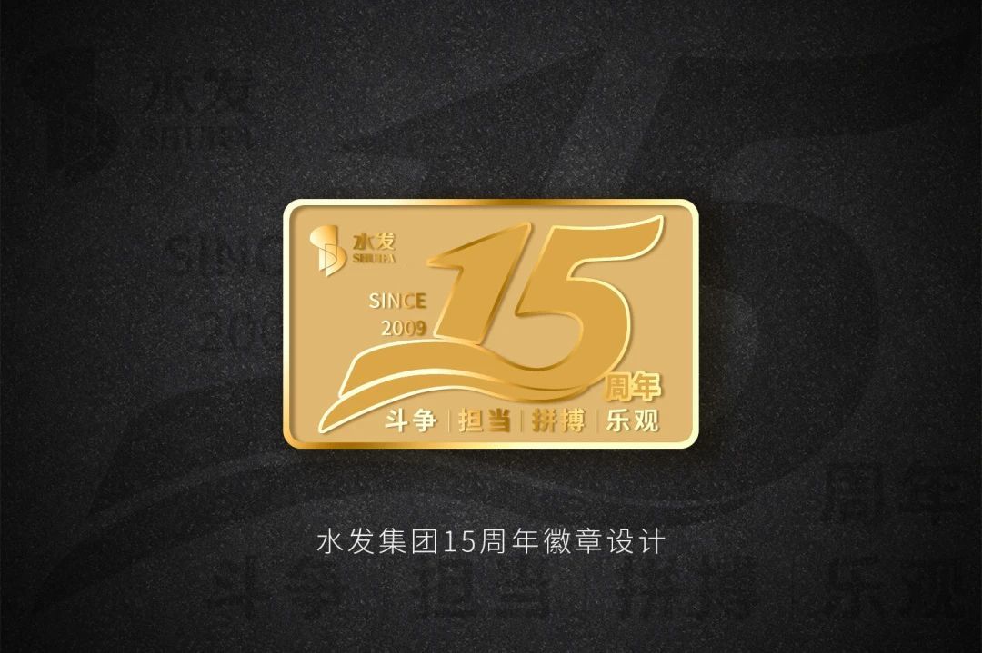 水發(fā)集團(tuán)因水而興,從2009至2024年已走過(guò)15個(gè)春秋,數(shù)字“15”結(jié)合流動(dòng)的水來(lái)設(shè)計(jì),并結(jié)合了“斗爭(zhēng)、擔(dān)當(dāng)、拼搏、樂(lè)觀(guān)”的新水發(fā)精神,金色的徽章更顯品質(zhì)。